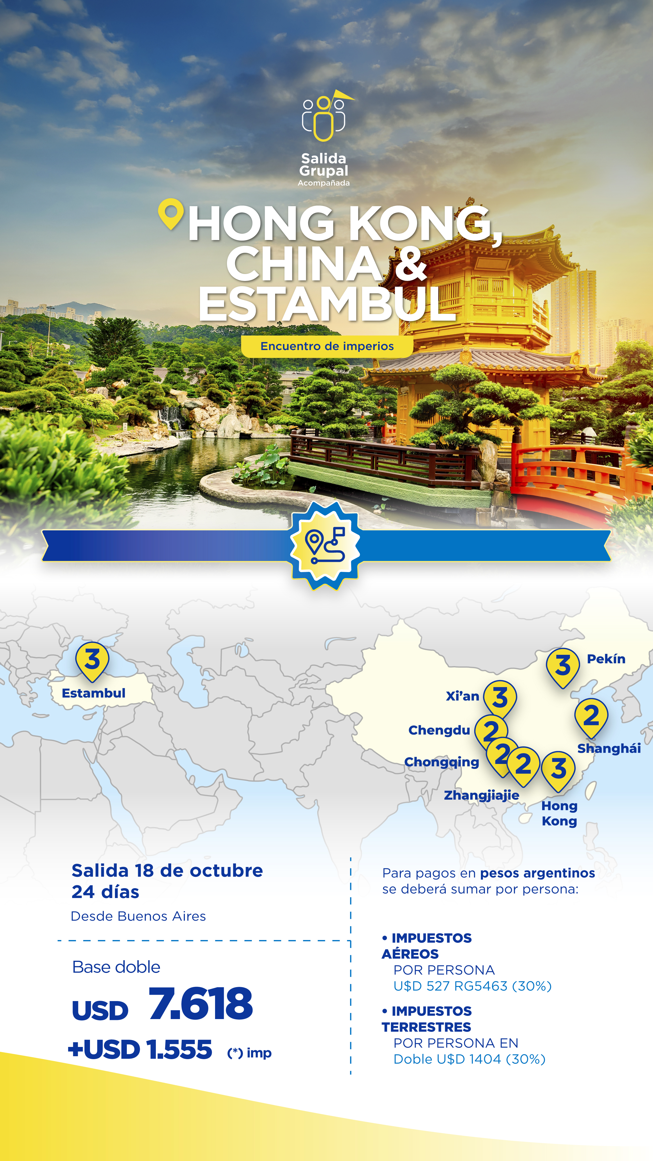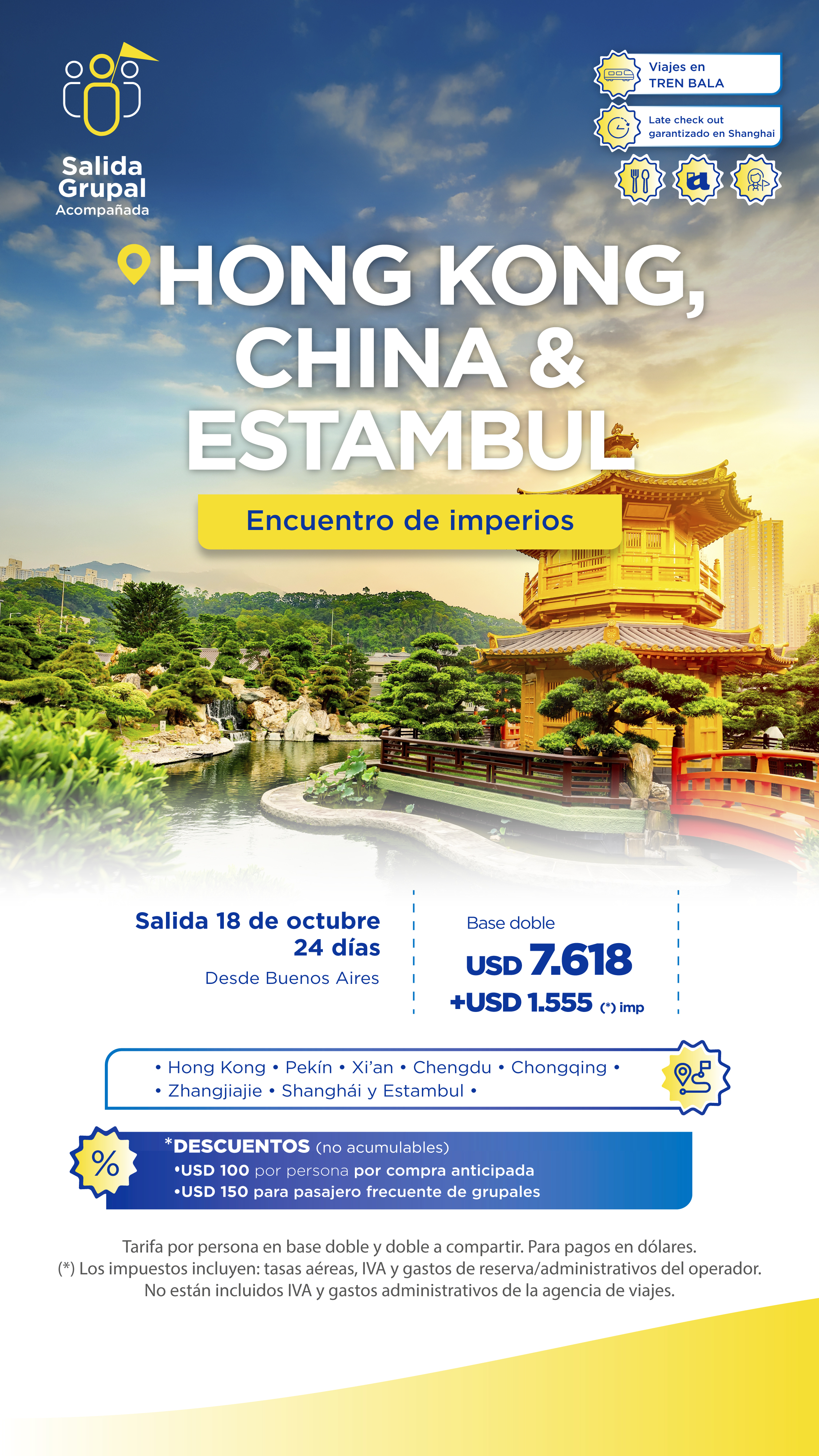 23-10-2026. Luego del desayuno, partimos hacia Pekín, la Capital de China, una gigantesca ciudad y el núcleo político del país. Visitaremos los Hutong de Beijing, barrios históricos con calles estrechas y casas tradicionales, testigos de la vida auténtica de la capital. Por la noche, disfrutaremos una cena de pato asado pekinés, plato emblemático de la cocina china, con piel crujiente, carne tierna y servido con panqueques y salsas tradicionales. Alojamiento.