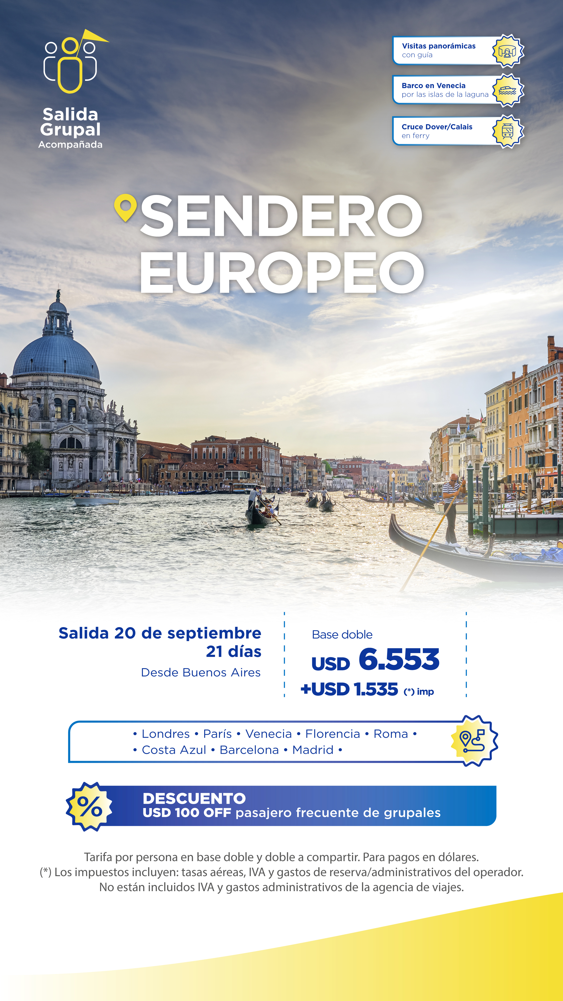 IMPORTANTE GARANTIZAMOS tarifa base doble en habitación a compartir reservando hasta 45 días antes de la salida. Entre 44 y 10 días antes de la salida CONSULTAR con su asesor de ventas.