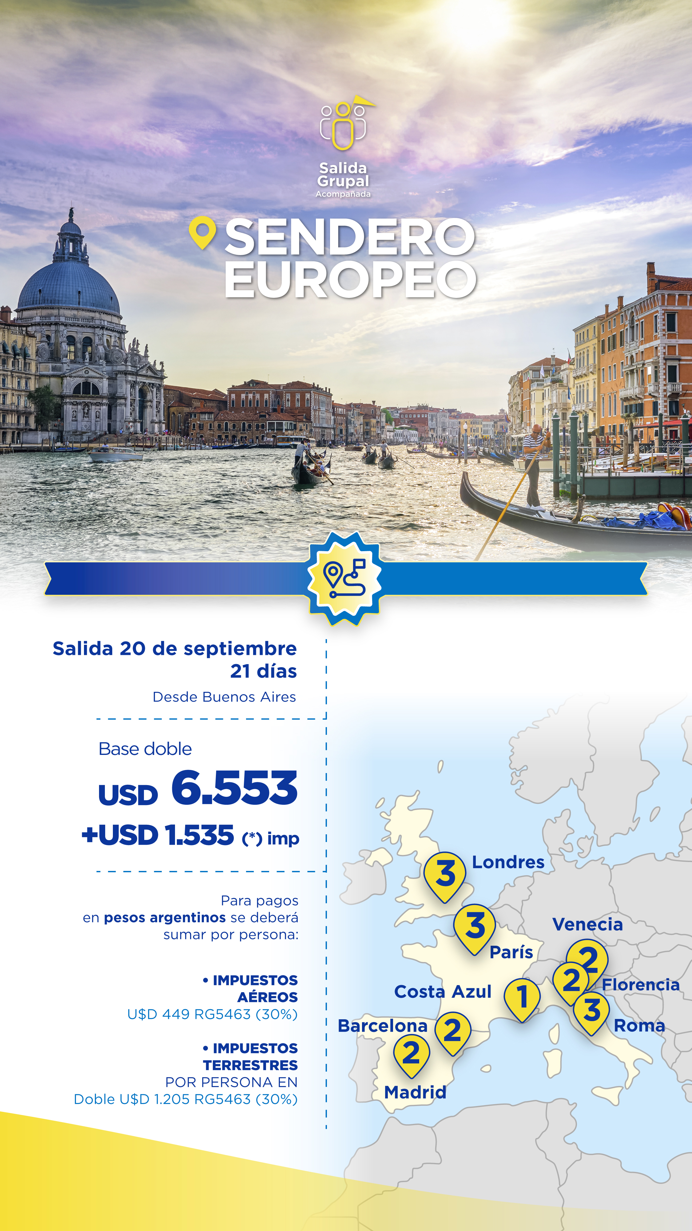 La documentación necesaria para el viaje: pasaporte o visas, es de responsabilidad absoluta del pasajero. Quedando a su disposición cualquier inquietud sobre los requisitos migratorios o sanitarios de cada destino.
