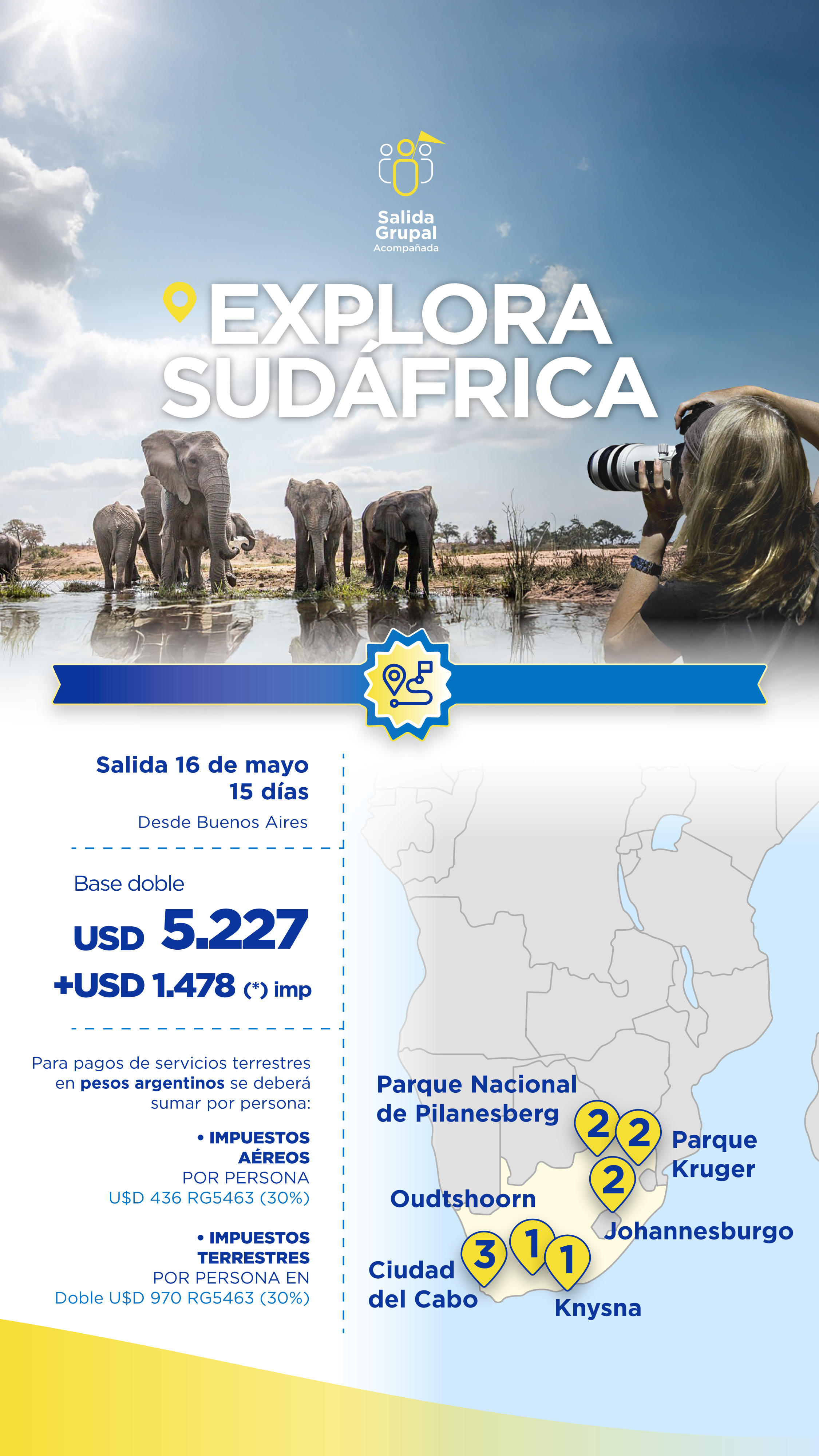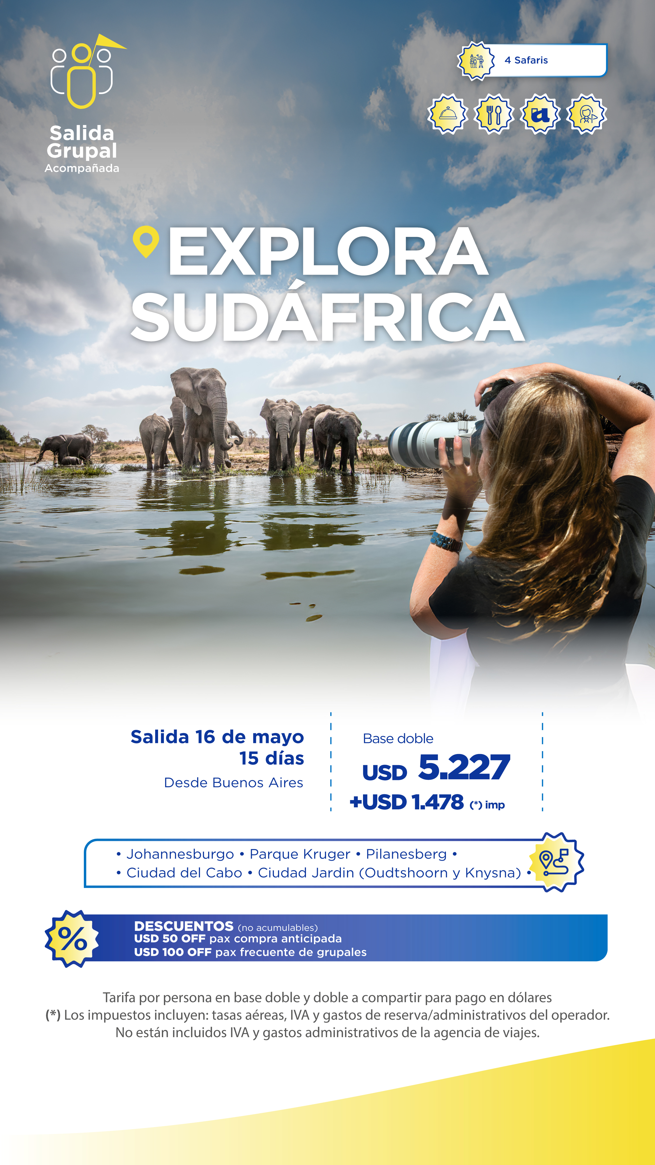 18-05-2026 Arribo al Aeropuerto Internacional de Johannesburgo a las 03.55 hs. Recepción y traslado al hotel con guía/conductor de habla castellana. Late check in incluido. Al mediodía realizaremos la excursión: Johannesburgo y Soweto, donde tendremos la oportunidad de explorar los impresionantes edificios históricos del centro financiero de Johannesburgo, visitar la Casa de Nelson Mandela en Soweto, recorrer la emblemática calle Vilakazi y admirar Soccer City "Calabash", el estadio que fue sede del Mundial 2010. Regreso al hotel. Alojamiento en Johannesburgo.