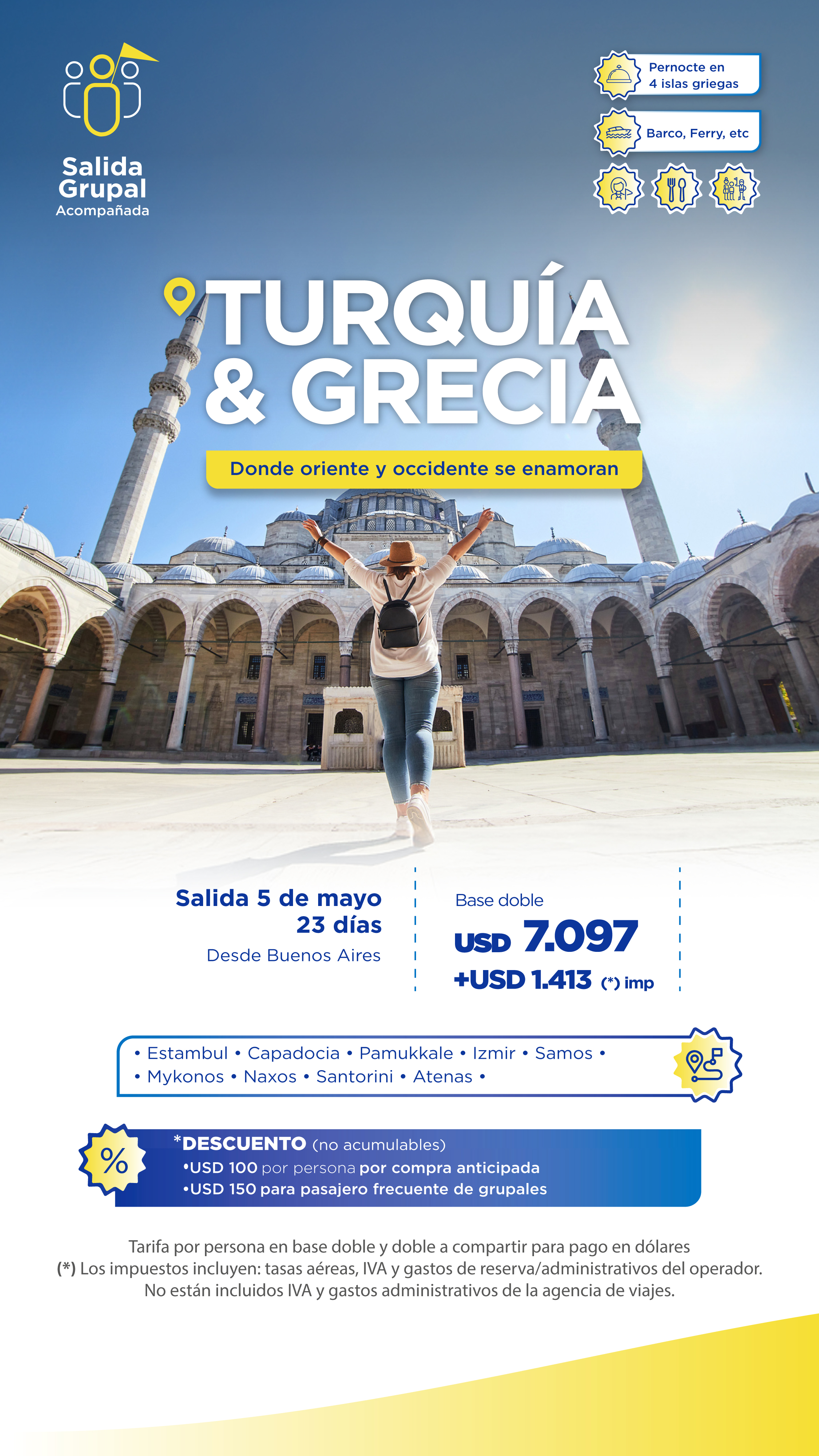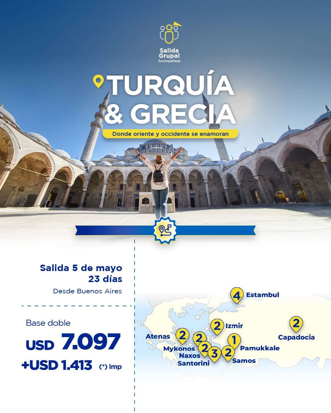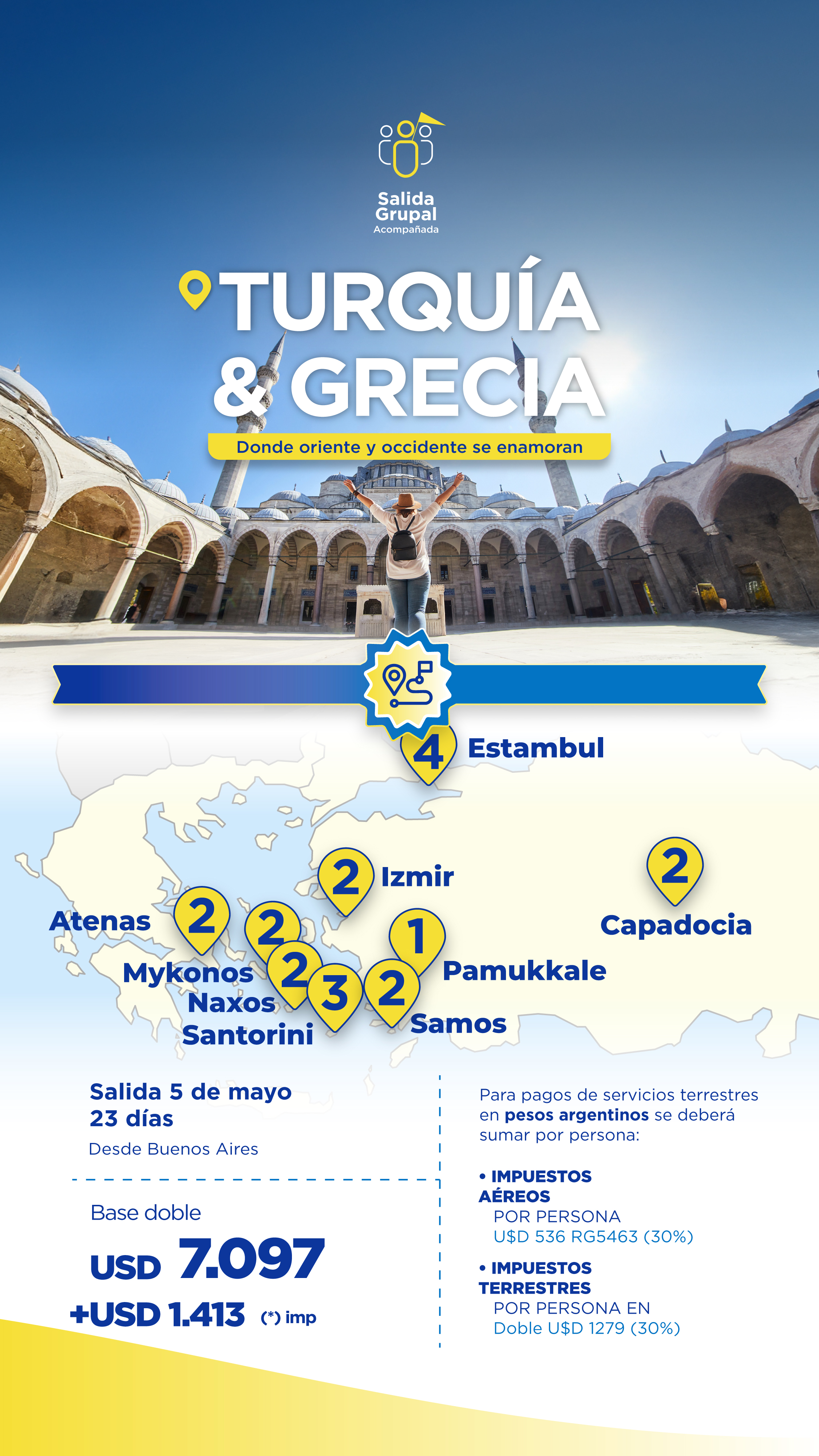 - 20 noches de alojamiento con régimen desayuno: 4 en Estambul, 2 en Capadocia, 1 Pamukkale, 2 en Izmir, 2 en Samos, 2 en Mykonos, 2 en Naxos, 3 en Santorini y 2 en Atenas.