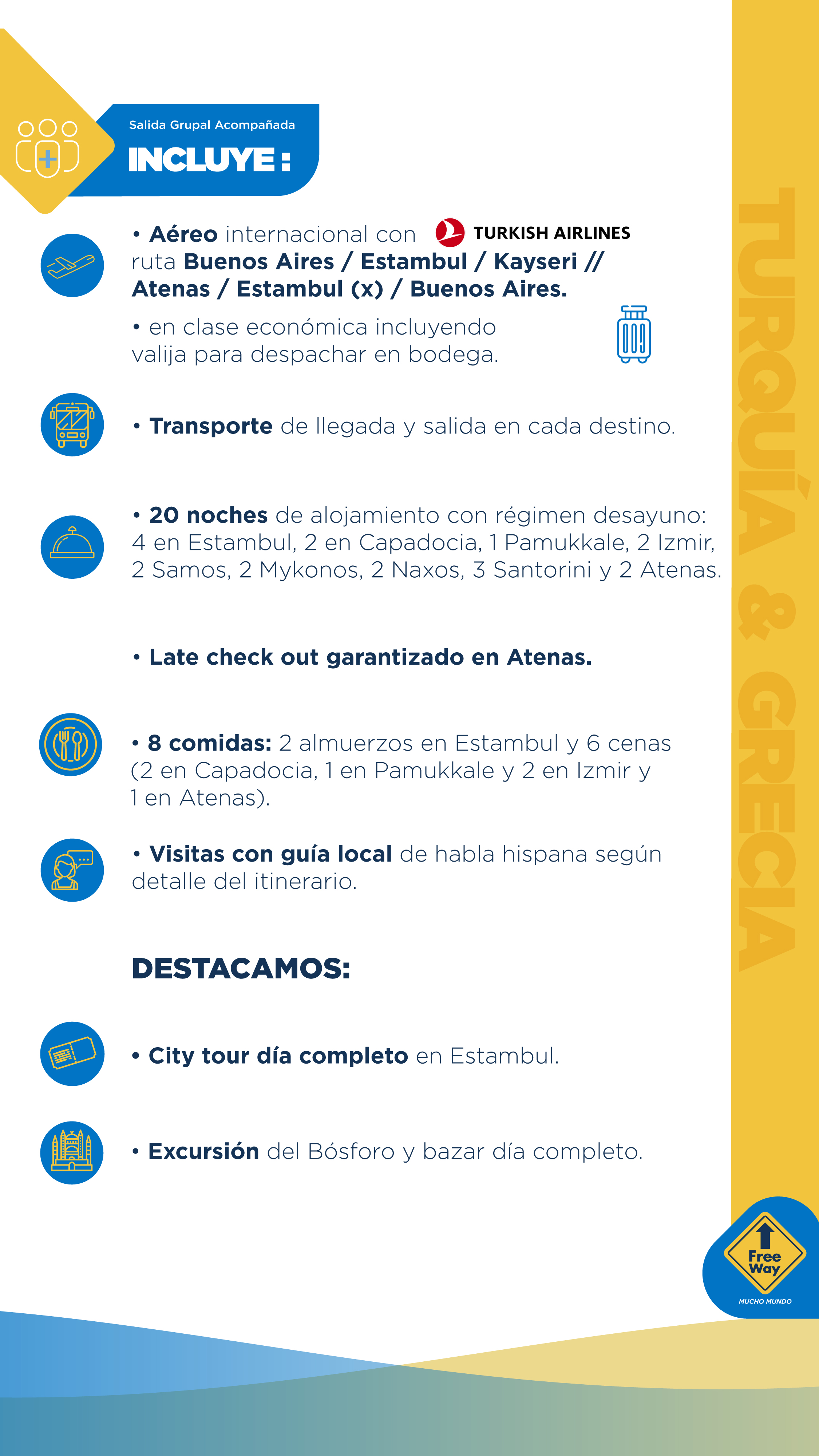 - Aéreo internacional con Turkish Airlines Buenos Aires / Estambul / Kayseri // Atenas / Estambul (x) / Buenos Aires en clase económica incluyendo valija para despachar en bodega.